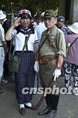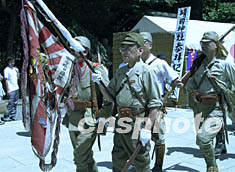 ![]() 十五日是日本戰(zhàn)敗五十七周年紀(jì)念日,在供奉有二戰(zhàn)戰(zhàn)犯的的靖國(guó)神社前,一群穿著原“鬼子兵”軍服的人趾高氣揚(yáng)地來(lái)回游走。陶光雄 攝