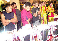 ![]() 2002世界泰拳金腰帶慈善大賽組委會(huì)十六日在澳門舉行新聞發(fā)布會(huì),綽號(hào)“草原雄鷹”的中國(guó)選手格日樂圖(左)和對(duì)手在會(huì)上亮相。李剛 攝