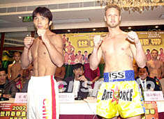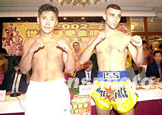 ![]() 2002世界泰拳金腰帶慈善大賽組委會(huì)十六日在澳門舉行新聞發(fā)布會(huì),綽號(hào)“怪俠三毛”的中國(guó)選手王三楨(左)在會(huì)上與對(duì)手共同亮相。李剛 攝