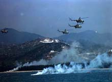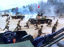 解放軍東海聯(lián)合演練 高科技與實(shí)戰(zhàn)融為一體(圖) 2002年08月19日 08:32 ![]() 步坦協(xié)同,席卷敵陣 ![]() 戰(zhàn)鷹突破空中防線 ![]() 獵潛艇劈波斬浪 ![]() 直升機(jī)臨空支援 中新網(wǎng)北京8月19日消息:中國官方媒體人民網(wǎng)昨晚發(fā)表解放軍在東海演習(xí)的照片,從照片中可以看到演習(xí)動(dòng)用了坦克、軍艦、戰(zhàn)機(jī)和直升機(jī)。 據(jù)人民網(wǎng)報(bào)道,東海某海域進(jìn)行三軍聯(lián)合作戰(zhàn)演習(xí)的南京軍區(qū)隊(duì)及配屬的?哲婈(duì),把現(xiàn)代高科技與未來實(shí)戰(zhàn)需要融為一體,為全面掌握現(xiàn)代戰(zhàn)爭(zhēng)的特點(diǎn)和主動(dòng)權(quán)﹑制勝權(quán)。 報(bào)道指,三軍將士以飽滿的熱情真打真練,能謀善戰(zhàn),斗志高昂,樹立了敢打必勝的信心。