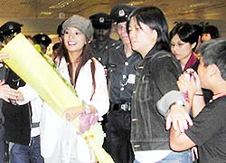 兩大機(jī)場搭客大廈皆出動多名保安,但縱觀兩邊聲勢,趙薇抵步時,七八十名影迷洶涌而上,還得保安警察圍成人墻“護(hù)駕”。反之,前往為舒淇接機(jī)的影迷寥寥可數(shù),舒淇走得優(yōu)哉閑哉,意圖夾道的保安警察可謂英雄無用武之地。