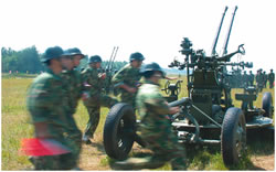 演習(xí)剛剛開始,一隊(duì)民兵在我高炮陣地附近忙碌著,他們很快設(shè)立了一個(gè)高炮陣地,原來(lái)他們是用報(bào)廢的高炮設(shè)置了一個(gè)假高炮陣地以迷惑來(lái)襲之“敵”。與此同時(shí),另一隊(duì)民兵在旁邊給一枚導(dǎo)彈模型充氣,不到一分鐘,這枚同樣是用于迷惑“敵人”的地空導(dǎo)彈便豎立起來(lái)。