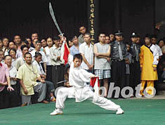 在近日舉行的少林、武當(dāng)、峨眉三大武術(shù)精英賽上,少林小子賴全亮表演的少林競賽刀贏得滿堂喝彩。作者:魯彥