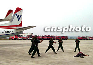 演練在下午二點十分開始:一架由廣州飛往綿陽的運七航班飛機被兩名“歹徒”劫持,機上共有乘客五十名。一名持刀“歹徒”挾持婦女為人質(zhì),另一“歹徒”聲稱攜帶有炸彈,索要人民幣二百萬元。當(dāng)?shù)毓矙C關(guān)接到報警后,馬上采取了緊急救援程序。武警、巡警、刑警、消防等相關(guān)部門近千名警員、近百輛警車和特種車輛,在二十分鐘內(nèi)集結(jié)到位,對機場進行了封鎖和控制。