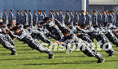 北京市保安系統(tǒng)首屆運動會九月十五日在奧體中心舉行。此次運動會是該系統(tǒng)組建十六年以來的第一次,也是對北京四萬九千余名保安員的大閱兵。圖為開幕式上精彩的防衛(wèi)術及擒拿術表演。任海霞 攝