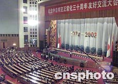 紀(jì)念中日邦交正;苣暧押媒涣鞔髸(huì)今晚在人民大會(huì)堂舉行。一萬三千余名日本來賓會(huì)聚于此,與中方各界人士共同紀(jì)念這個(gè)對(duì)兩國人民都具有重要意義的日子。會(huì)上,江澤民主席代表中國政府和人民并以他個(gè)人的名義對(duì)這次活動(dòng)的成功舉辦表示祝賀,向參加活動(dòng)的各位日本朋友表示歡迎。