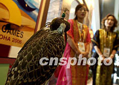 一只卡塔爾蒙面金雕在十月的釜山亞運(yùn)會(huì)新聞中心里,為下屆亞運(yùn)會(huì)在多哈舉行身為吉祥物公關(guān)。作者:賈國(guó)榮