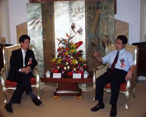 海南省委副書記羅保銘(右)與中新社總編輯郭招金(左)交談。