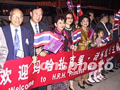 專程從泰王國飛抵?谟釉娏胀ü鞯囊话俣嗝﹪D相l(xiāng)親,在機場拉起了寫著泰文與中文的橫幅,揮舞著中國、泰國國旗,在十五的滿月下笑迎詩琳通公主。