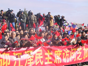 中資機(jī)構(gòu)和當(dāng)?shù)厝A人華僑、留學(xué)生代表數(shù)百人到機(jī)場(chǎng)歡迎江主席一行 中新社記者 呂振亞 攝