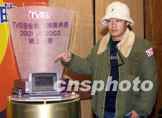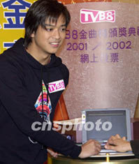 歌星陳曉東10月23日在香港出席《TVB8金曲榜頒獎(jiǎng)典禮2001/2002》記者會(huì),為《TVB8金曲榜頒獎(jiǎng)典禮2001/2002》在網(wǎng)上為喜愛的歌曲投票。鄧慶樂 攝