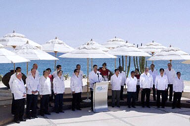 記者看到,上午八時(shí)半左右,墨西哥總統(tǒng)福克斯即在會(huì)場(chǎng)外一一迎候與會(huì)者。九時(shí)許,按APEC傳統(tǒng),與會(huì)領(lǐng)導(dǎo)人和代表著東道主提供的特色民族服裝拍攝“全家!。與上屆上海峰會(huì)的中式唐裝相比,今天的“瓜亞貝拉”同樣極有“個(gè)性”,它是墨西哥東南部流行的一種傳統(tǒng)服裝,為精一色的白色,有四個(gè)胸袋。合照背景為太平洋碧藍(lán)的大海,藍(lán)白相襯,在美麗的洛斯卡沃斯留下了一道亮麗的風(fēng)景線。
