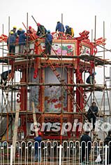 北京市政工程人員三十日在北京長(zhǎng)安街上安裝宮燈,迎接即將召開的中共第十六次全國(guó)代表大會(huì)。作者:毛建軍