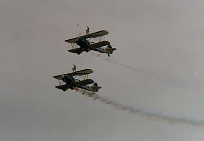英國UBB空中雜技表演隊駕駛老式波音-斯蒂曼爾雙翼機首次作了精彩的空中雜技表演。兩架飛機密集編隊,兩名女子站在飛機機翼上時而揮手,時而倒立,十分驚險。