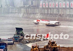 “金山4號(hào)”駛出導(dǎo)流明渠入口,頓時(shí)五彩氣球放飛起來,正在截流的施工車和“金山4號(hào)”都拉響了汽笛,聲震峽江兩岸,有著5年航運(yùn)史的三峽導(dǎo)流明渠從此永遠(yuǎn)封航。截流后,將在它上面崛起三峽工程的右岸大壩。