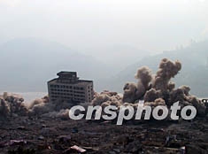 三峽庫(kù)區(qū)迄今為止最大規(guī)模爆破,四日上午十時(shí)五十分在重慶奉節(jié)實(shí)施。這座具有詩(shī)城美譽(yù)的千年歷史文化名城傾刻間灰飛煙滅,明年三峽庫(kù)區(qū)二期蓄水后這里將成為一片汪洋。前來(lái)參加爆破實(shí)施的中國(guó)國(guó)務(wù)院三峽建設(shè)委員會(huì)副主任、重慶市副市長(zhǎng)甘宇平成為了媒體采訪的焦點(diǎn)人物,他表示此次爆破意味著三峽庫(kù)區(qū)建筑物爆破工作基本結(jié)束。作者:鄒輝