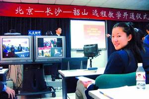 中新網(wǎng)11月7日電 昨天下午,“北京—長沙—韶山遠(yuǎn)程教學(xué)直通車”正式開通。北京人大附中、湖南長沙一中和韶山學(xué)校高二的幾十名同學(xué)在各自的遠(yuǎn)程教室上了一堂別開生面的課。這是我國首次實(shí)現(xiàn)跨省區(qū)實(shí)時交互式的遠(yuǎn)程教學(xué)。