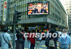 中共十六大11月8日在北京開幕,香港有線電視臺全程直播。中共中央總書記江澤民作報(bào)告時(shí),正值香港金融心臟中環(huán)一帶緊張的上班時(shí)間,但仍然有不少市民駐足觀看。任晨鳴 攝