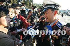 一名胸掛勛章的警方代表在北京出席中共十六大,受到多家媒體的包圍采訪。作者:毛建軍