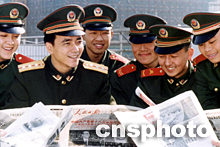 黨的十六大勝利召開引起部隊官兵的廣泛關注,連日來,武警南京市支隊充分利用每天“聽廣播、讀報、看新聞聯(lián)播”三個“半小時”時間,及時組織部隊收聽收看黨的十六大會議報道,激勵青年官兵立足軍營建功立業(yè)的豪情壯志,永遠做黨和人民的忠誠衛(wèi)士。圖為11月9日午休后,八中隊中隊長婁曙光(圖中)組織戰(zhàn)士們閱讀當天報紙。中新社傳真 吳俊攝