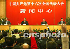 中共“十六大”十日在北京的新聞中心舉行記者招待會,中外記者爭相舉手向國家發(fā)展計劃委員會主任曾培炎和國家經(jīng)貿(mào)委主任李榮融提問。作者:毛建軍