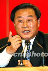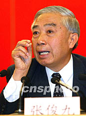 中華全國總工會(huì)副主席張俊九和中國社會(huì)勞動(dòng)保障部部長(zhǎng)張左已十一日在中共十六大新聞中心舉行新聞發(fā)布會(huì)。張俊九回答記者提問。毛建軍 攝