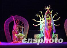 中國一流藝術家十六日和十七日晚在巴黎香榭麗舍大劇院推出“今夜星光燦爛”文藝晚會,為上海申辦世界博覽會造勢助威。此次晚會由上海市政府和中國駐法國大使館主辦。圖為上海歌舞團表演大型民族舞蹈《華夏舞韻》。作者:蔚中