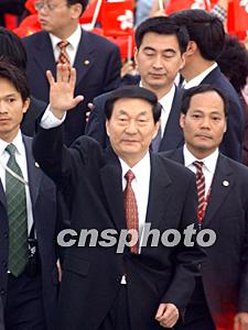參加“第十六屆世界會(huì)計(jì)師大會(huì)”開幕式的中國(guó)國(guó)務(wù)院總理朱镕基,11月18日下午乘坐專機(jī)抵達(dá)香港機(jī)場(chǎng),登車前朱镕基特意向記者招手致謝。中新社傳真 任晨鳴 攝