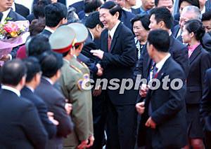 中國(guó)國(guó)務(wù)院總理朱镕基和夫人勞安,11月18日下午乘坐專機(jī)抵達(dá)香港參加“第十六屆世界會(huì)計(jì)師大會(huì)”。中新社傳真 任晨鳴 攝