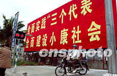 中共十六大閉幕不久,海南省?谑袊d路旁十八日掛出“全面實踐‘三個代表’全面建設(shè)小康社會”的巨幅宣傳標(biāo)語牌。作者:鄒憲