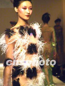 新古典主義·璞玉.甘曉川2003春夏時(shí)裝發(fā)布會(huì),二十四日晚在北京中國(guó)大飯店舉行,其服裝設(shè)計(jì)融合古今,體現(xiàn)出大膽前衛(wèi)的設(shè)計(jì)理念。圖為一款色彩艷麗的透視裝。作者:盛佳鵬