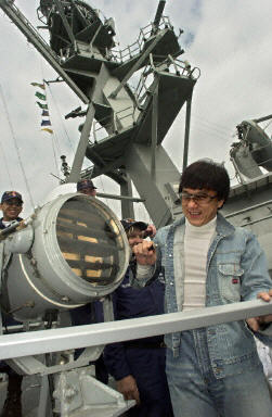 當(dāng)成龍?zhí)ど霞装鍟r(shí),看見艦上的機(jī)槍,便二話不說跑到機(jī)槍前,向維多利亞港作狀開槍掃射,姿勢(shì)有板有眼。當(dāng)參觀船上的總控制臺(tái)時(shí),艦長(zhǎng)教他如何駕駛,令成龍十分興奮。不少船員更自備相機(jī),爭(zhēng)相與他合照。由于盛情難卻,成龍一口氣為逾百船員簽名。