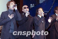 香港東魅力旗下的四人男子組合EO2成員,謝凱榮、彭懷安、洪智杰和王志安,11月25日推出首張專輯《我知道》,唱片公司為改變他們的形象,特地花了20多萬港元為他們選購意大利名牌西裝出席記者會。香港明星譚詠麟、陳百祥,11月25日在中環(huán)皇后迪士高內(nèi)為東魅力旗下組合EO2推出新碟,宣傳造勢。洪少葵攝