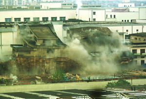 據(jù)悉,此次爆破拆除的武漢卷煙廠鍋爐房,高21.2米,建筑面積4500平方米,共埋設(shè)炸藥320公斤。武漢爆破公司利用鍋爐房內(nèi)3個(gè)總?cè)莘e達(dá)70立方米的煤斗,封閉成“水池”,各層樓面也“筑”成蓄水池。池水中設(shè)藥包,利用水的不可壓縮性,在爆破瞬間形成“高速霧化的水幕”,捕捉粉塵。隨著一聲巨響,鍋爐房頹然倒下,爆破后騰起的不是遮天灰幕,而是一團(tuán)“白霧”,約5分鐘就散盡了。