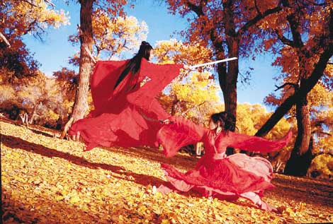 中新網(wǎng)11月27日電 張曼玉在電影《英雄》中除了跟梁朝偉于九寨溝瀑布前比劍外,還跟章子怡在內(nèi)蒙古一處遍地黃葉的胡楊林中比武。雖然誰勝誰負(fù),要在電影中才有分曉,但單論畫面,意境就極之凄美。