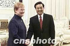 中新社北京十一月二十七日電(記者張朔)中國國家副主席胡錦濤今天下午在人民大會(huì)堂會(huì)見芬蘭總統(tǒng)塔里婭·哈洛寧時(shí)說,在新世紀(jì),中方愿與芬方一道,以更加積極務(wù)實(shí)的態(tài)度推動(dòng)雙邊友好合作關(guān)系全面健康穩(wěn)定地向前發(fā)展。
