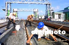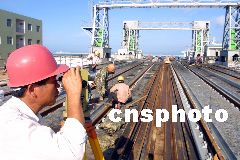 12月2日,隨著最后一根長(zhǎng)25米的特制鐵軌,成功鋪設(shè)在粵海鐵路南港棧橋橋面,全長(zhǎng)8738米的粵海鐵路南港棧橋鐵軌與海口火車(chē)站鐵軌接軌。至此,中國(guó)第一條跨海鐵路粵海鐵路南北港碼頭鐵路線全線貫通。圖為施工人員在南港棧橋上進(jìn)行測(cè)量和鋪軌工作。古月 攝