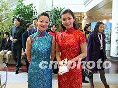 十二月三日,靚麗的中國申博形象大使袁鳴(左)和丁曉軍身著民族服裝出現(xiàn)在摩納哥國際展覽局會議場館內,引來很多關注的目光。作者:崔煜芳