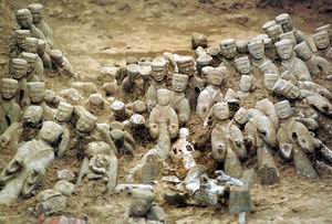 在長(zhǎng)9.7米、寬1.9米的陪葬坑內(nèi),展現(xiàn)在世人眼前的是距今二千多年前的漢代王侯貴族車(chē)馬出行時(shí)的豪華陣容,只見(jiàn)最前一排是五匹陶制的高頭大馬,馬身上都騎著神態(tài)各異、栩栩如生的陶俑。