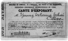 這張編號(hào)為2819的參展證正面,是顧永保的照片,還印有1900的字樣;背面上端的法文是:“貿(mào)易部、工業(yè)部、郵電通訊部1900年國(guó)際全球展覽”;參展者名字處是“永珍齋”的拼音,另起一行是法文“中國(guó)”,再下面則是三條參展的規(guī)定。
