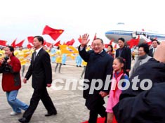 上午9:10時,國務(wù)院副總理、中國申博代表團團長李嵐清和夫人,中共中央政治局委員、國務(wù)委員、國家申博委主任吳儀,中共中央政治局委員、上海市委書記、上海市市長、國家申博委副主任陳良宇等步下舷梯,接受了四名少先隊員代表獻上的鮮花。上海市市領(lǐng)導(dǎo)到機場迎接。