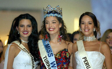 摘取2002年“世界小姐”桂冠的土耳其小姐阿茲拉·阿金(中)和獲亞軍的哥倫比亞小姐納塔利亞·佩拉爾塔(左)、獲季軍的秘魯小姐瑪麗娜·莫拉·蒙特羅(右)合影。