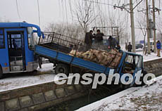 十五日,北京迎來了今冬第一場(chǎng)雪。在朝陽區(qū)金盞鄉(xiāng)路口,由于路面濕滑,一輛載豬卡車撞向路邊深溝,幸好沒有人員傷亡。作者:趙振清