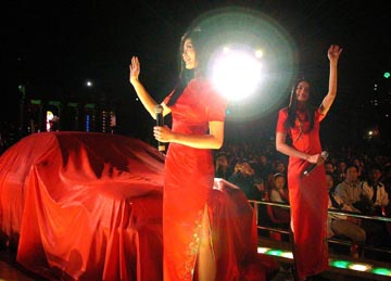 十六日晚,世界小姐李冰、吳英娜以南方電視臺形象大使的身份,參加在深圳世界之窗舉辦的一周年臺慶晚會。作者:陳文
