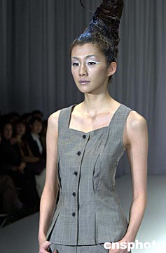 日本時裝設計師稻葉三千代十七日晚展示了她為電子時代設計的作品,其面料是由高級天然絹絲與最新技術的電磁波吸收體織成,能夠防止身邊無處不在的電器所散發(fā)的電磁波。作者:陶光雄