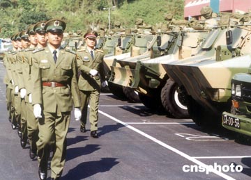 中國(guó)人民解放軍駐澳門部隊(duì)的裝甲機(jī)動(dòng)分隊(duì)軍容嚴(yán)整。作者:中新社