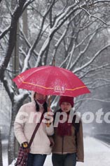 從二十日中午開始,北京飄下近些年難得一見的片片雪花,街頭一片銀裝素裹。兩名女青年撐起一把紅傘顯得格外醒目。作者:張煒