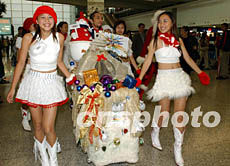 十二月二十日,香港機場購物廊圣誕慶祝活動揭開序幕,圖為身穿美麗服裝的女孩們將圣誕禮品派發(fā)給旅客。潘索菲 攝