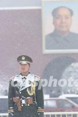 中國武警戰(zhàn)士二十三日在北京天安門廣場冒雪值勤。北京持續(xù)降雪的時間已經(jīng)一周。作者:滿會喬