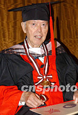 華僑大學(xué)授予許東亮先生名譽(yù)博士學(xué)位證書儀式十二月二十三日晚在香港舉行。國(guó)務(wù)院僑務(wù)辦公室副主任劉澤彭,為八十七歲高齡的許東亮博士頒發(fā)名譽(yù)博士學(xué)位證書。錢興強(qiáng) 攝
